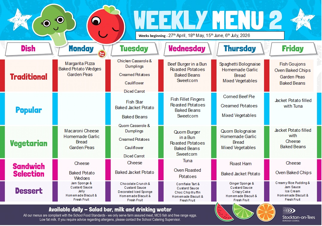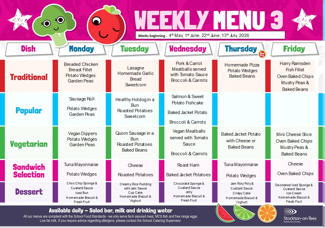 Our School Lunch Provider is Stockton Borough Council, lunches are booked daily and a wide selection is available, including salad and three dessert selections per day! A menu is sent out to each child and we ask that you discuss with him/her what they would like to eat. If there are any special dietary requirements, then please advise the school in writing.